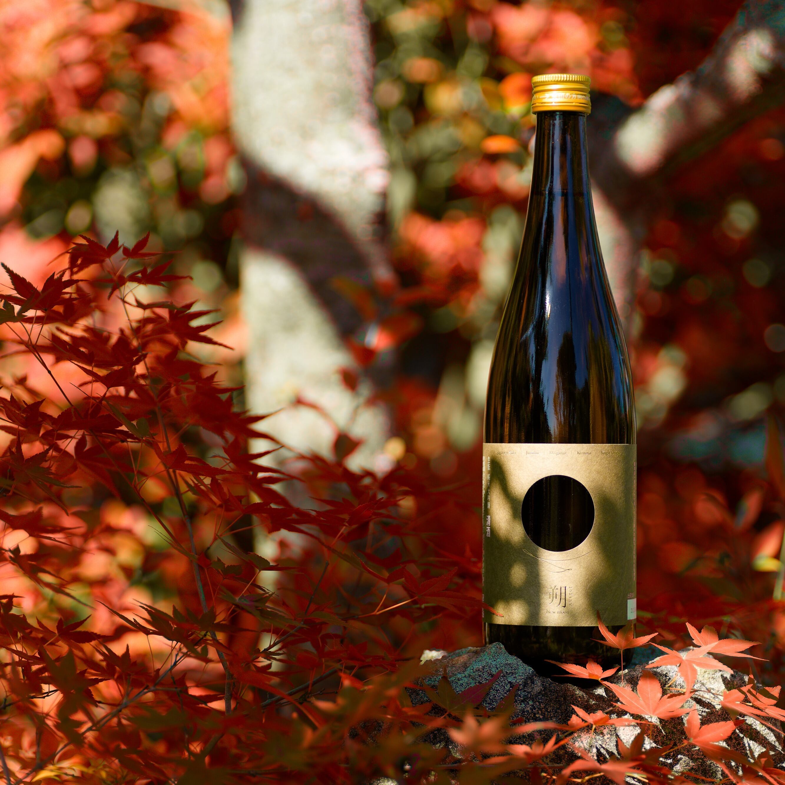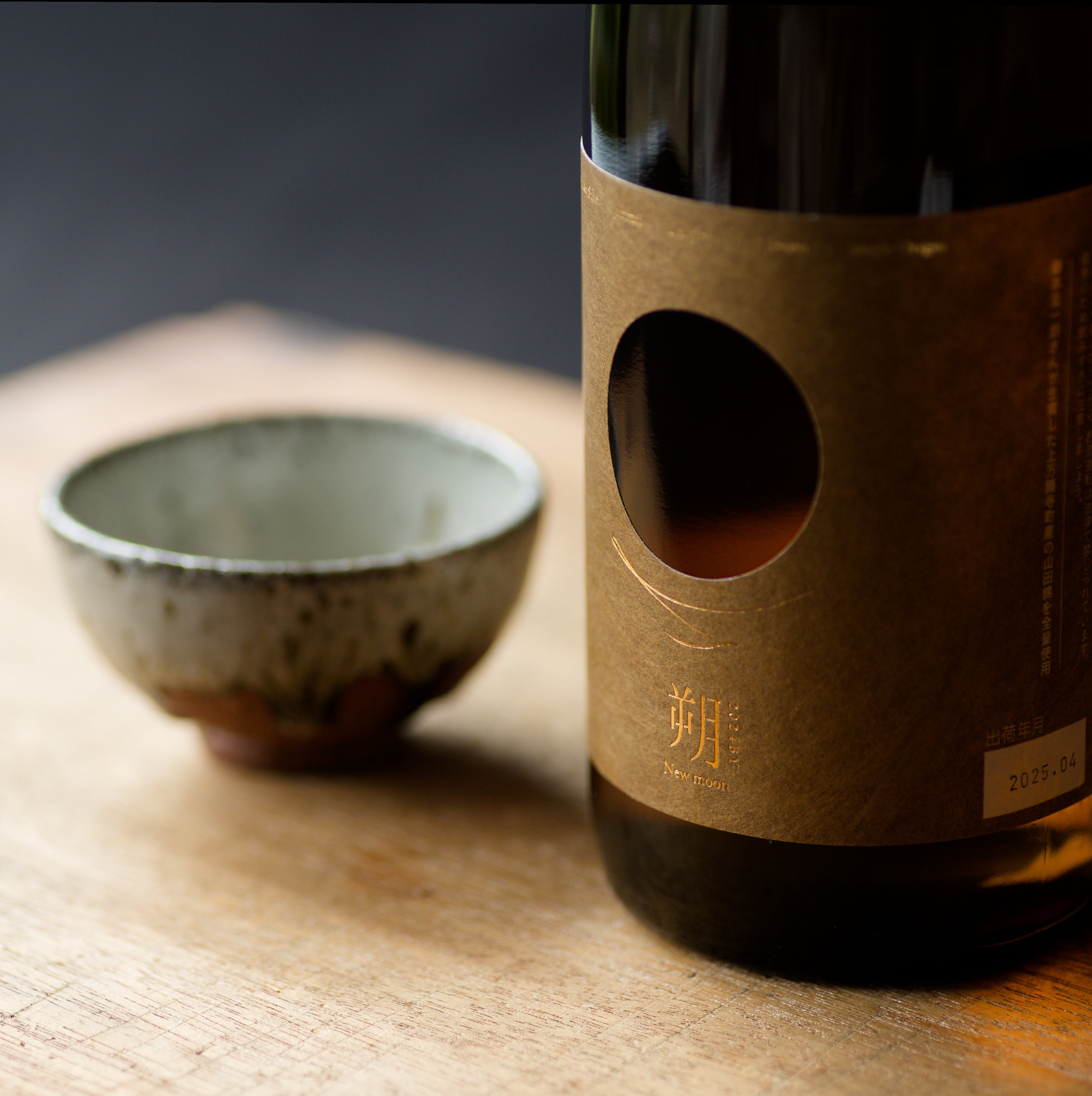 ボトルデザインは、「円窓からボトル裏の月を眺める」という朔ならではのコンセプトを今年も踏襲しました。ラベルカラーには、二十四節気のひとつ「啓蟄(けいちつ)」に着想を得た「赤金(あかきん)」を採用。山田錦を育む播磨の豊かな「土」をイメージしました。赤金は、古来より装飾品や象嵌などの伝統工芸にも用いられてきた色彩。その色を帯びたラベルは、和紙のような質感を持ち、遠目には落ち着いた茶褐色。 けれど近づけば、光の加減で鈍く輝き、奥深い表情を見せてくれます。
