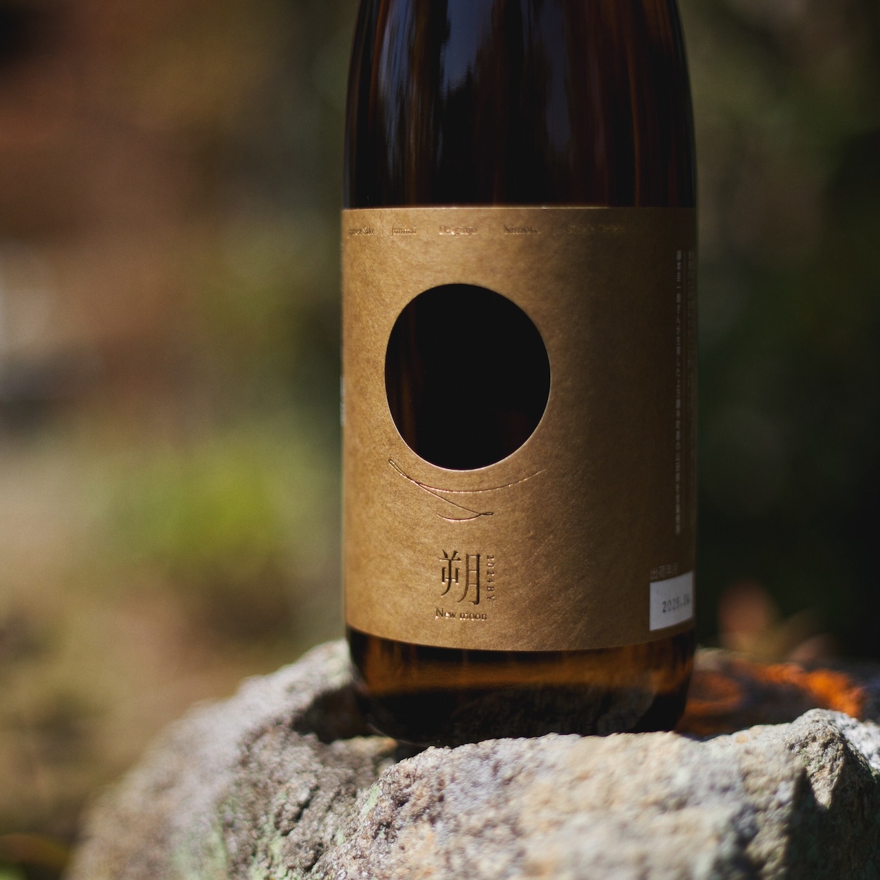 ボトルデザインは、「円窓からボトル裏の月を眺める」という朔ならではのコンセプトを今年も踏襲しました。ラベルカラーには、二十四節気のひとつ「啓蟄(けいちつ)」に着想を得た「赤金(あかきん)」を採用。山田錦を育む播磨の豊かな「土」をイメージしました。赤金は、古来より装飾品や象嵌などの伝統工芸にも用いられてきた色彩。その色を帯びたラベルは、和紙のような質感を持ち、遠目には落ち着いた茶褐色。 けれど近づけば、光の加減で鈍く輝き、奥深い表情を見せてくれます。